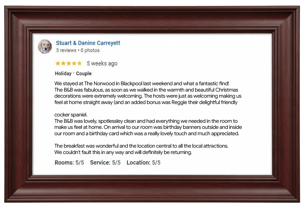 All guests booking direct will receive a £5 voucher per room to be spent at the Norwood Bar.